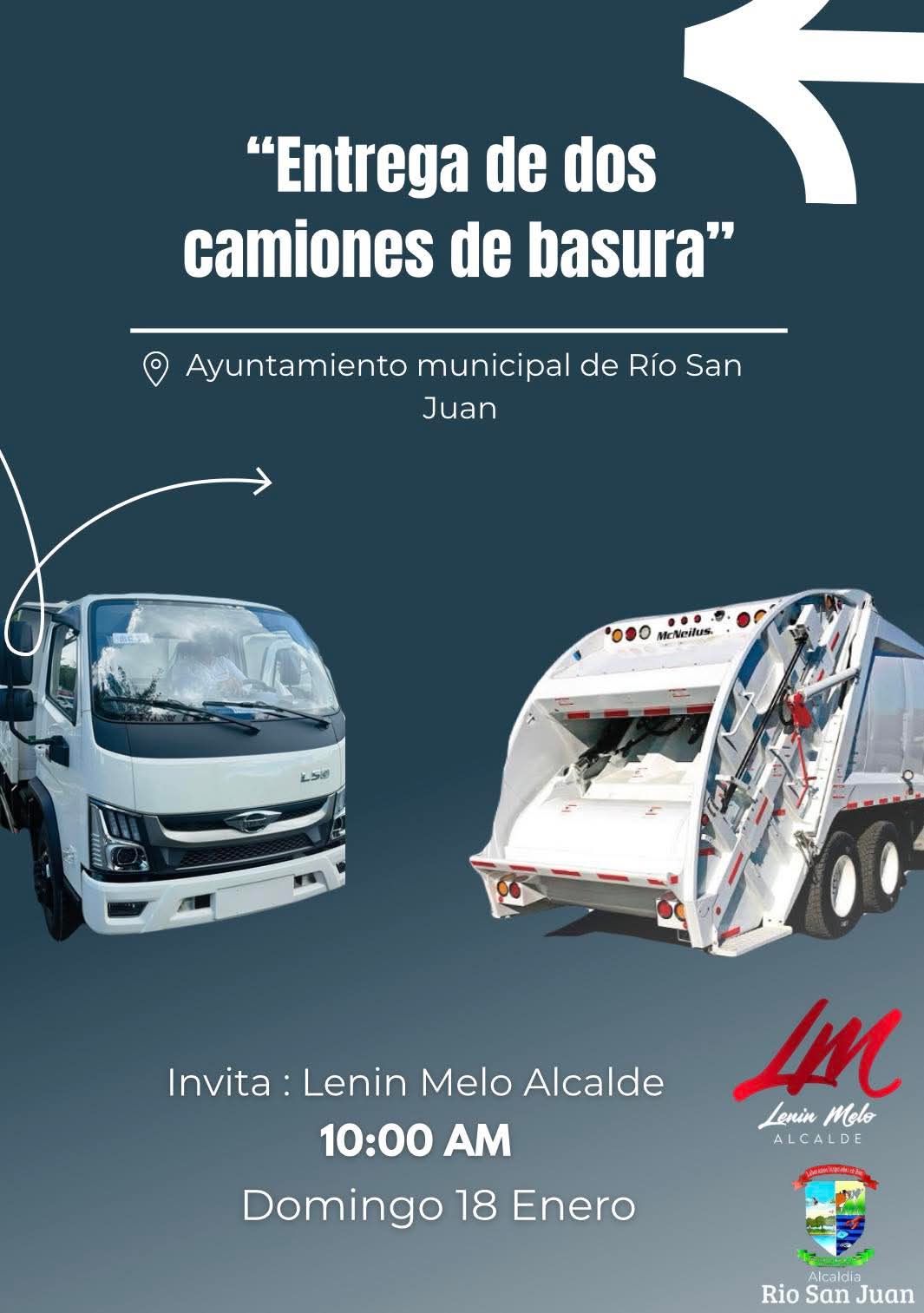 El Ayuntamiento Municipal de Río San Juan, bajo el liderazgo del alcalde Lenin Melo, tiene el honor de invitar a la comunidad a la entrega oficial de dos nuevos camiones recolectores de basura.