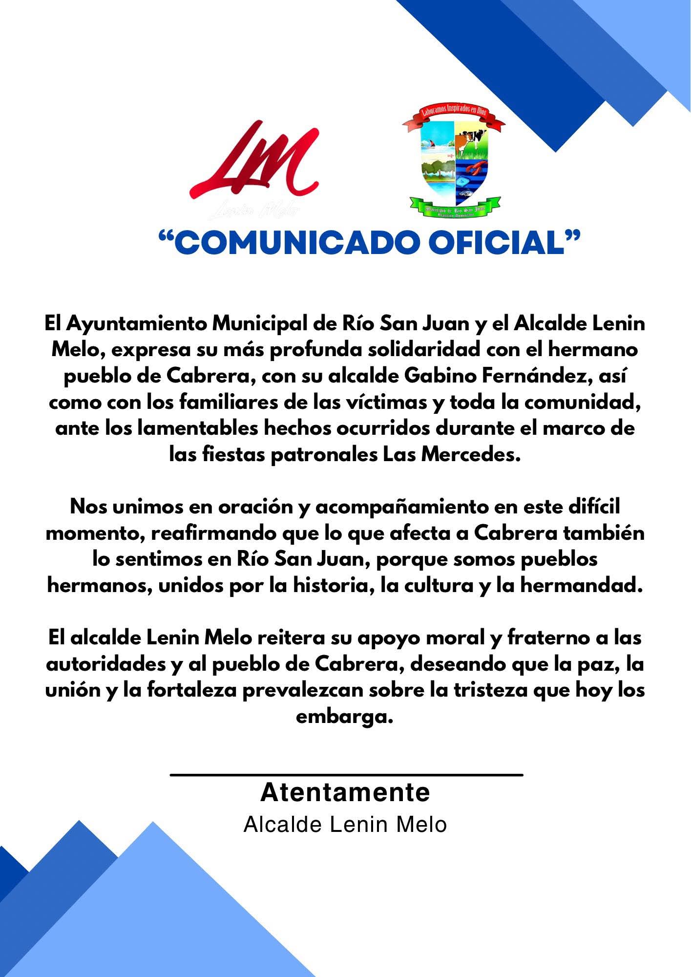 La Alcaldía de Río San Juan y nuestro alcalde Lenin Melo, expresan su más sincera solidaridad con el hermano pueblo de Cabrera, su alcalde Gabino Fernández, y las familias afectadas por los lamentables hechos ocurridos durante las fiestas patronales Las Mercedes.